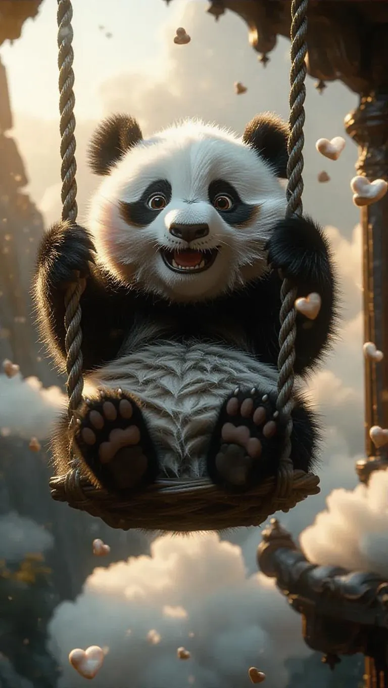 Fluffy, gray-and-white cloud pandas swing joyfully between magical cloud pillars. Button noses wiggle playfully, sleepy eyes shine with joy as they grip glowing heart-shaped ropes. Puffy paws dangle freely, clouds billow softly beneath them. Tiny cloud fairies hitch rides, giggling as they soar through the sky, carried by the gentle breeze and the rhythmic sway of the panda swings.