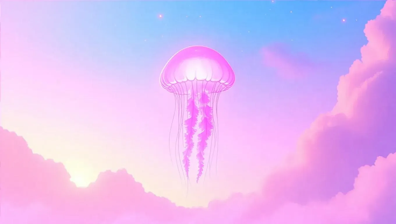 A luminescent jellyfish floating gracefully through vibrant sunset clouds, soft pink sky glowing with a dreamy, otherworldly aura, creating a serene and mystical atmosphere