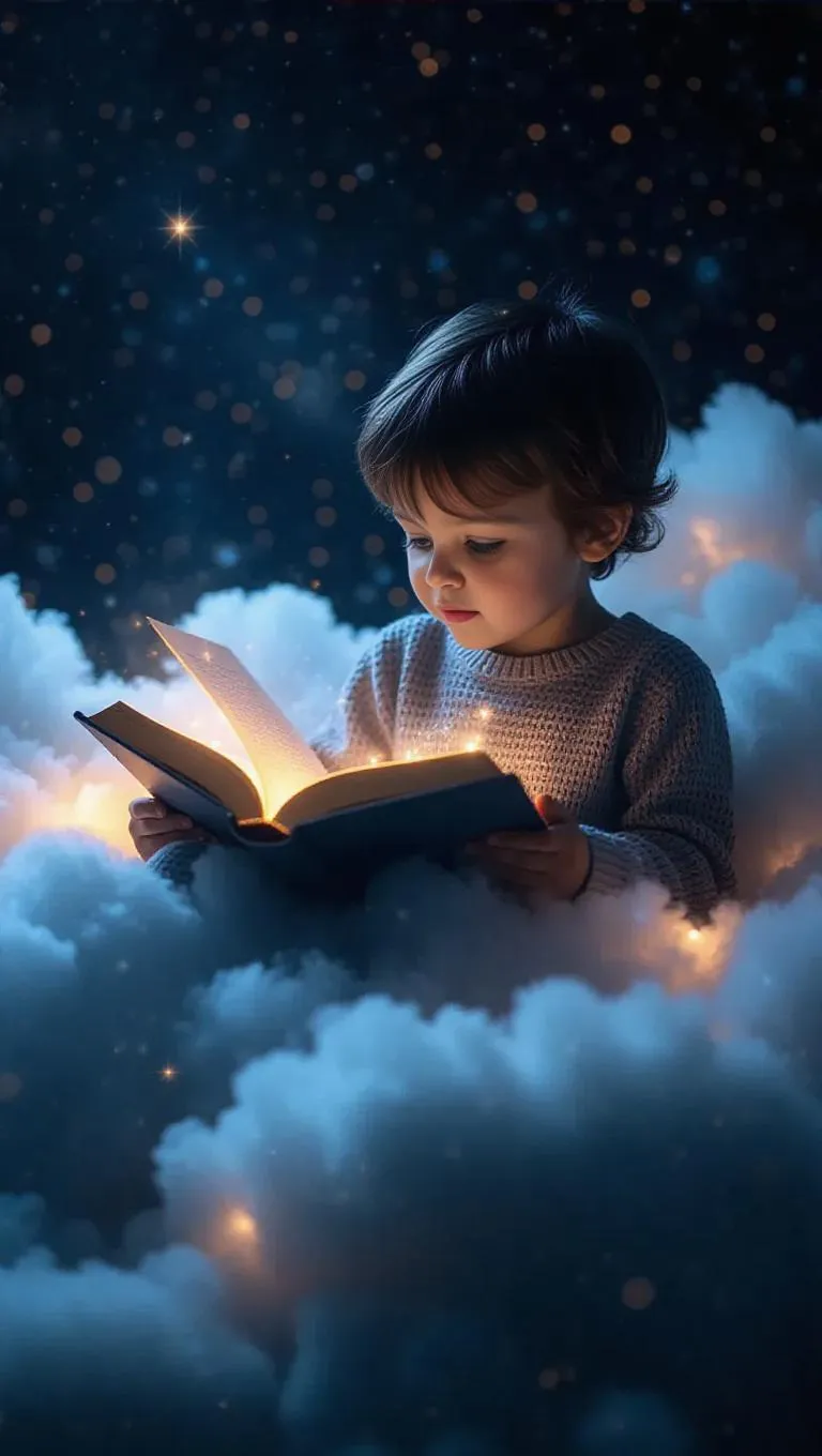 A child resting on a fluffy cloud, intrigued by a glowing book, highlighted by soft, snowy lighting, surrounded by bright stars and gentle mist, creating a magical and serene atmosphere