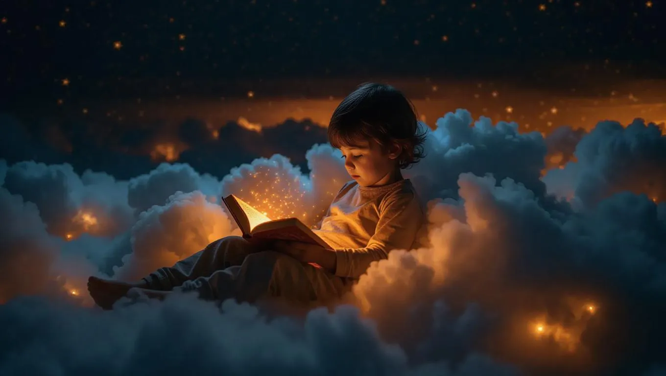 A child curled up on a fluffy cloud, reading a glowing book, illuminated by soft, orange lighting, surrounded by shining stars and gentle mist, creating a magical and serene atmosphere