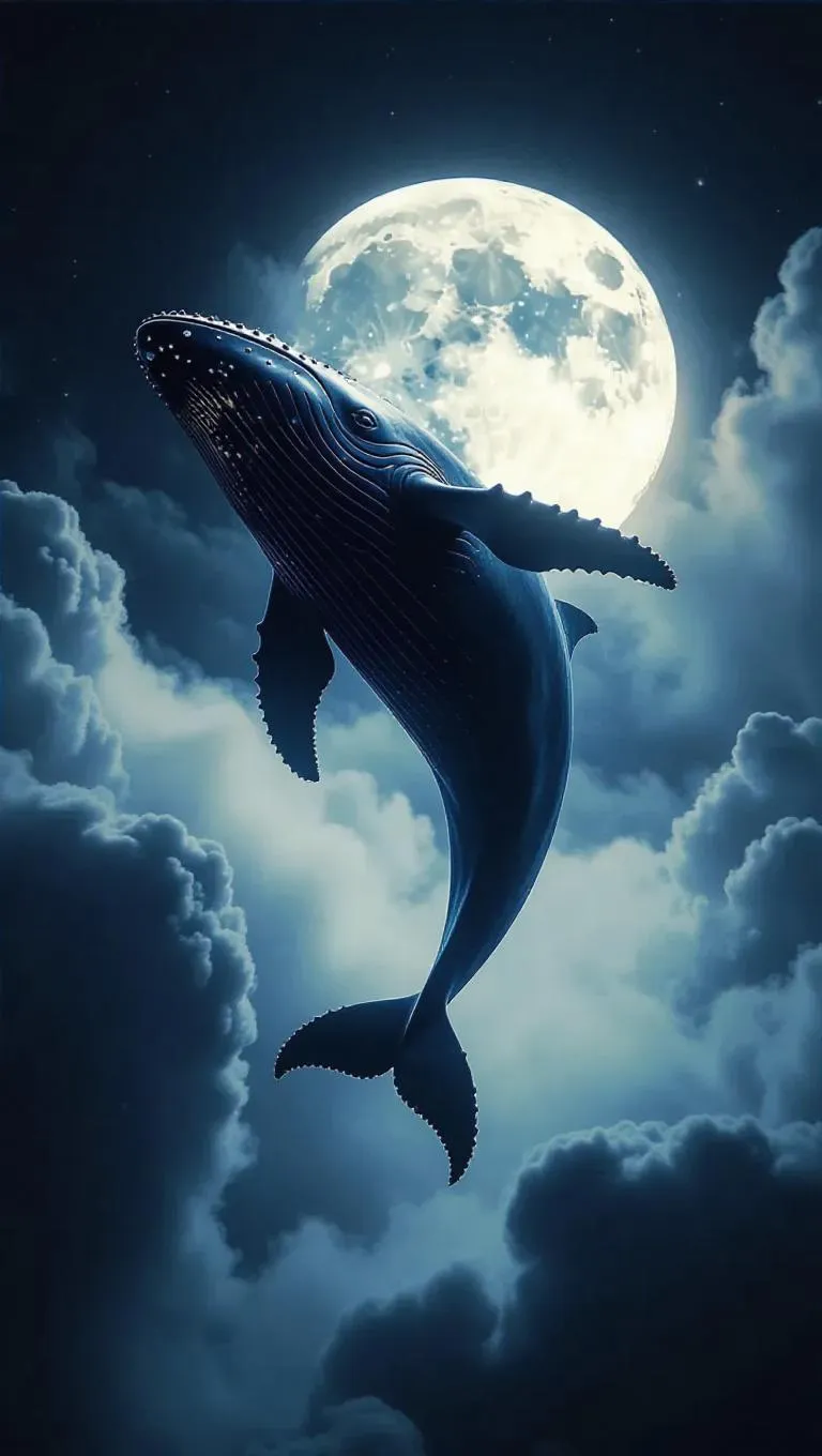 A colossal whale gliding through the misty sky, gracefully soaring over billowing clouds, with glimmering moonlight entwined around its body, casting a mystical glow, creating a surreal and enchanting scene