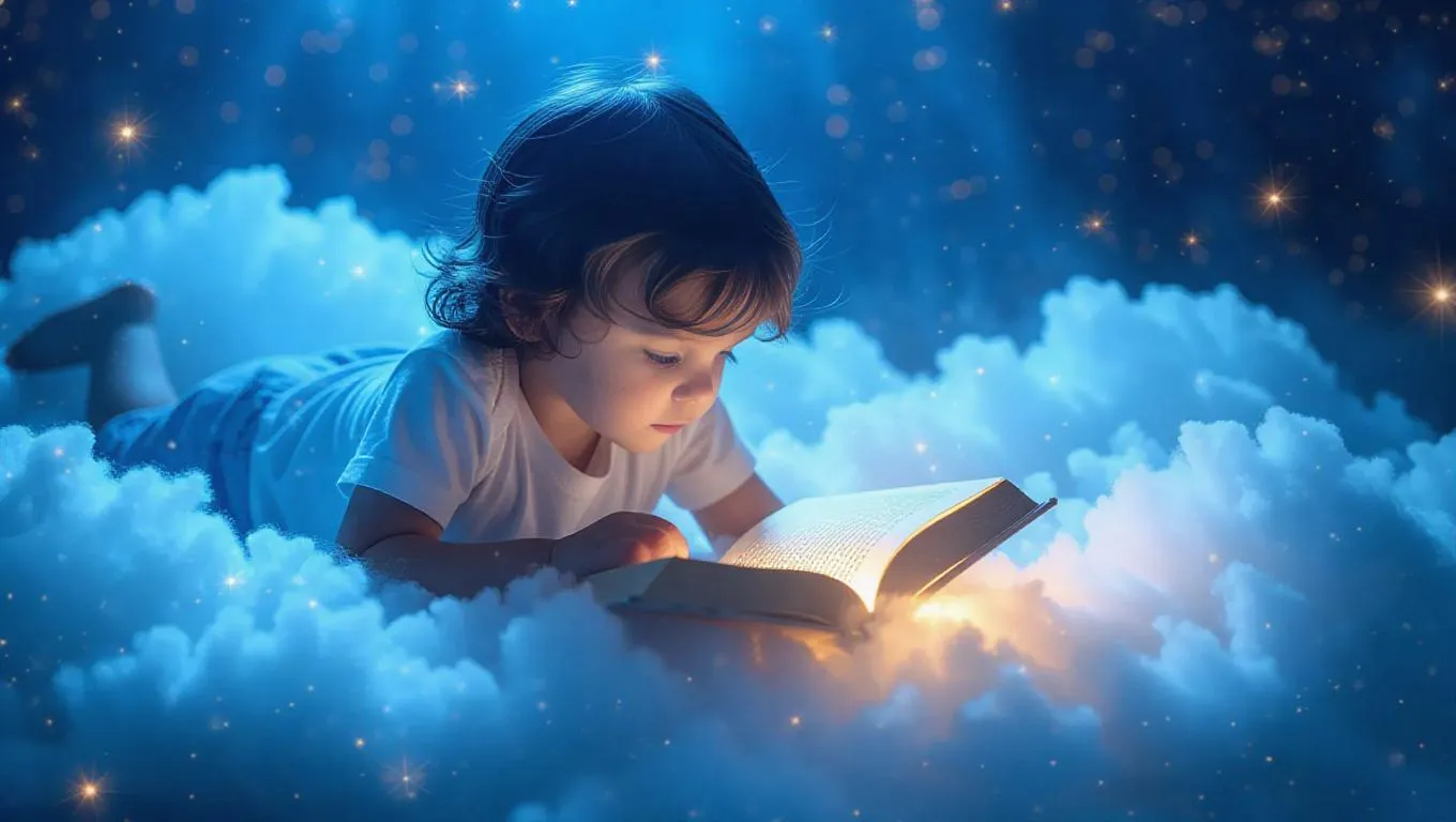 A child lying on a fluffy cloud, focused on a glowing book, illuminated by soft, blue lighting, surrounded by glimmering stars and gentle mist, creating a magical and serene atmosphere
