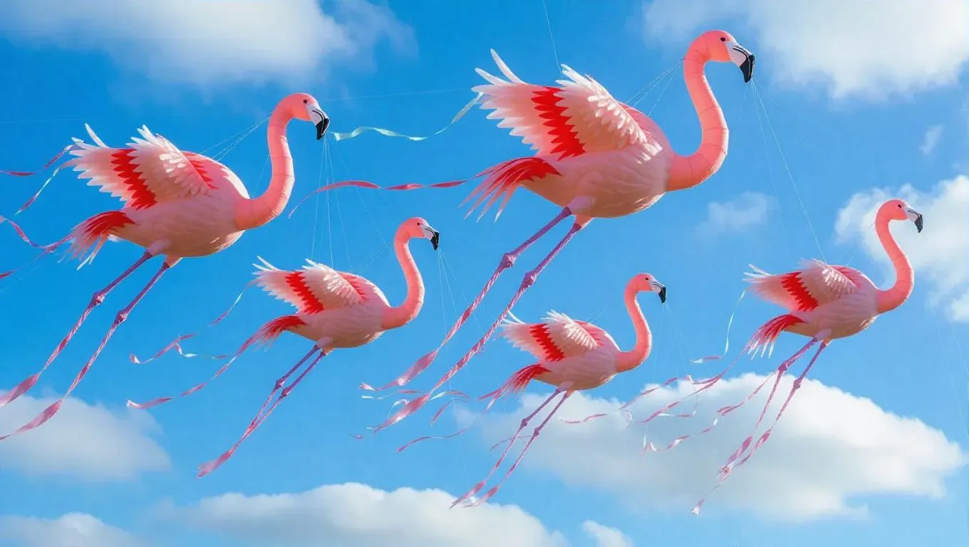 Fuzzy, cloud kites shaped like flamingos with long necks and elegant tails flutter in the sky, each adorned with a coral ribbon trailing in a shimmering stream. Cherubic sky sprites twirl as they tug on the strings, making the kites perform glides and chase floating banana clouds.