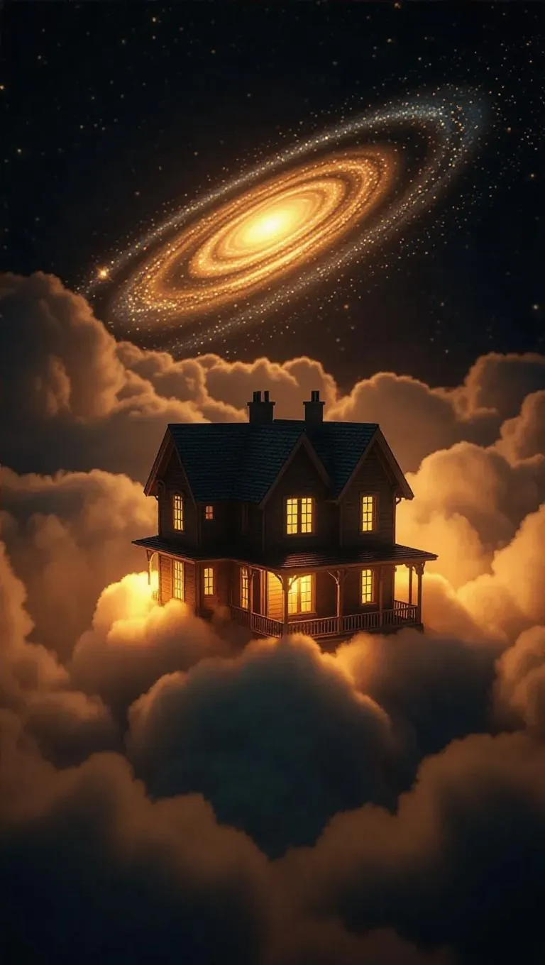 A quaint house floating on a soft cloud, warm golden light glistening from its windows, wrapped in ethereal clouds. Above, swirling galaxies twinkle in the night sky, creating a magical and serene atmosphere.