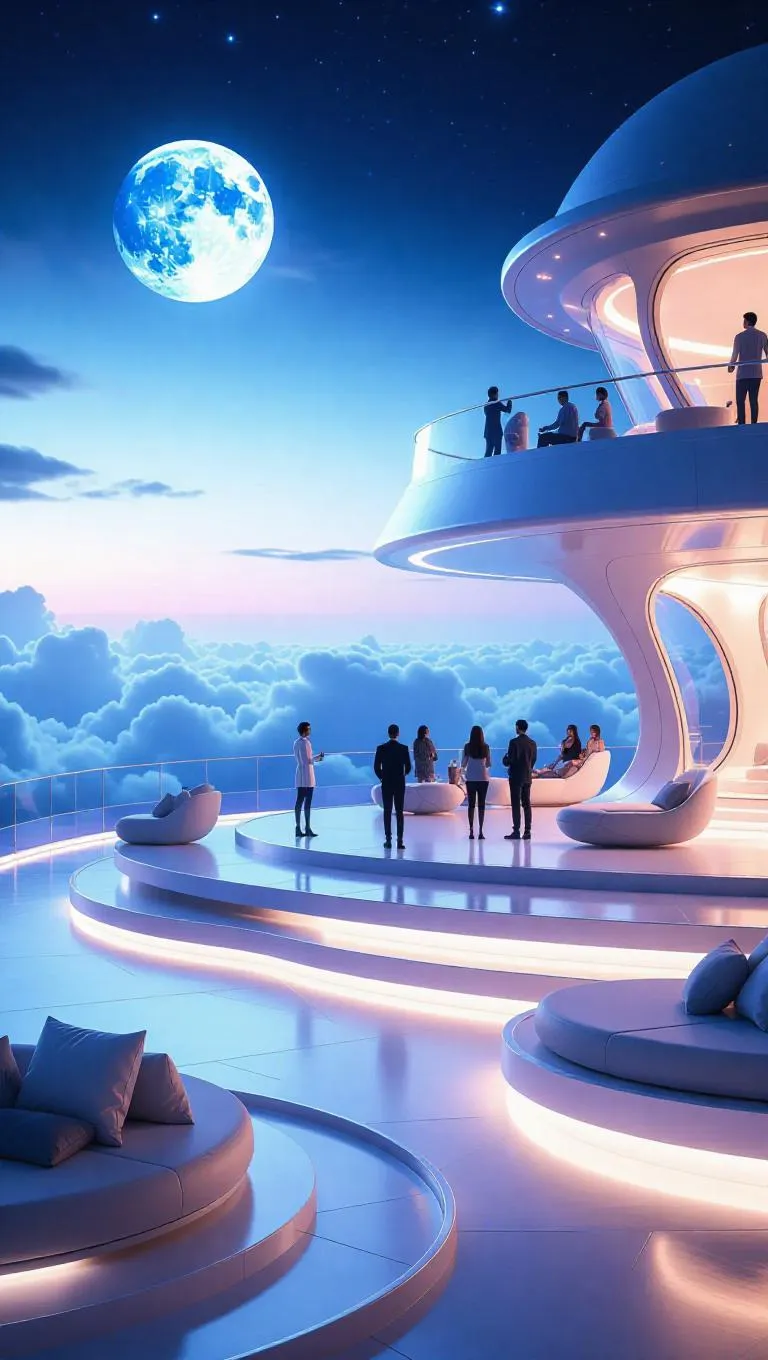 Guests gather on expansive, flat cloud-decks equipped with state-of-the-art telescopes and plush lounging areas. Expert astronomers share captivating stories and facts about the celestial bodies, while others savor snacks of cloud-spun cotton candy and star-fruit punch under the luminous glow of a full moon.