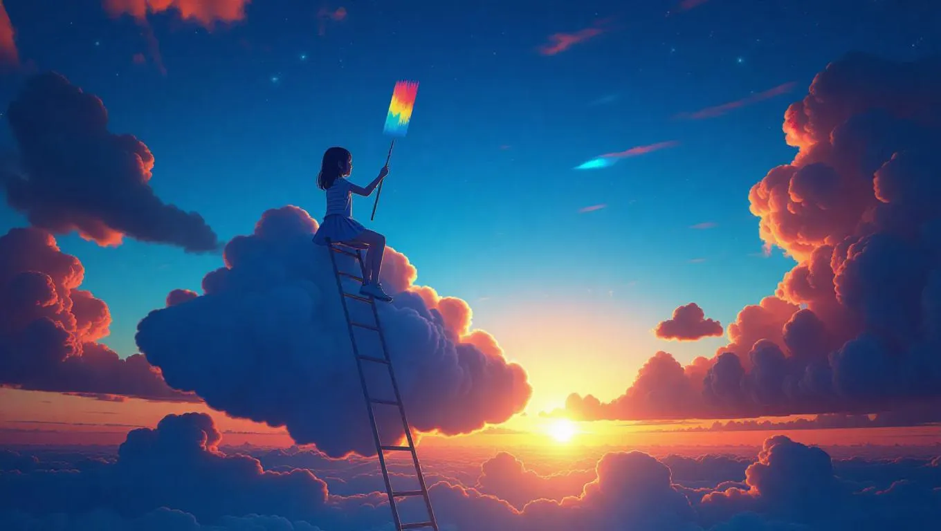 A girl perched on a ladder resting on a puffy cloud, cheerfully painting the sky with each stroke, transforming the colors of the sunset into a mesmerizing blend of deep blues, capturing the magic of twilight
