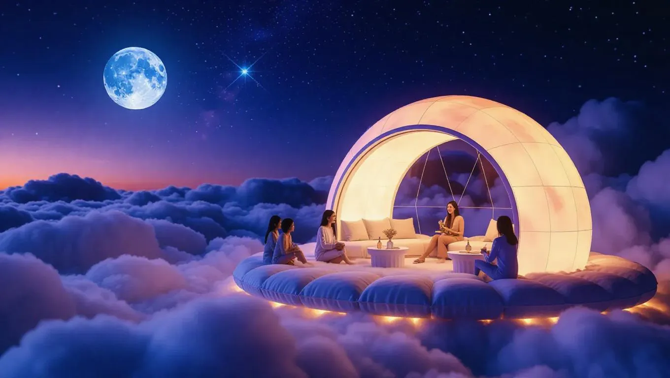 Guests gather on sprawling, soft cloud platforms equipped with innovative telescopes and cozy lounge areas. Skilled astronomers share enthralling stories and insights about celestial bodies, while others relish fluffy snacks and celestial drinks under the magical glow of a full moon.