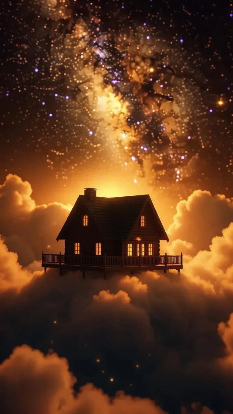 A charming lodge resting on a puffy cloud, warm golden light shining from its windows, surrounded by flickering will-o'-the-wisps. Above, cosmic phenomena dazzle the night sky, creating a magical and serene atmosphere.