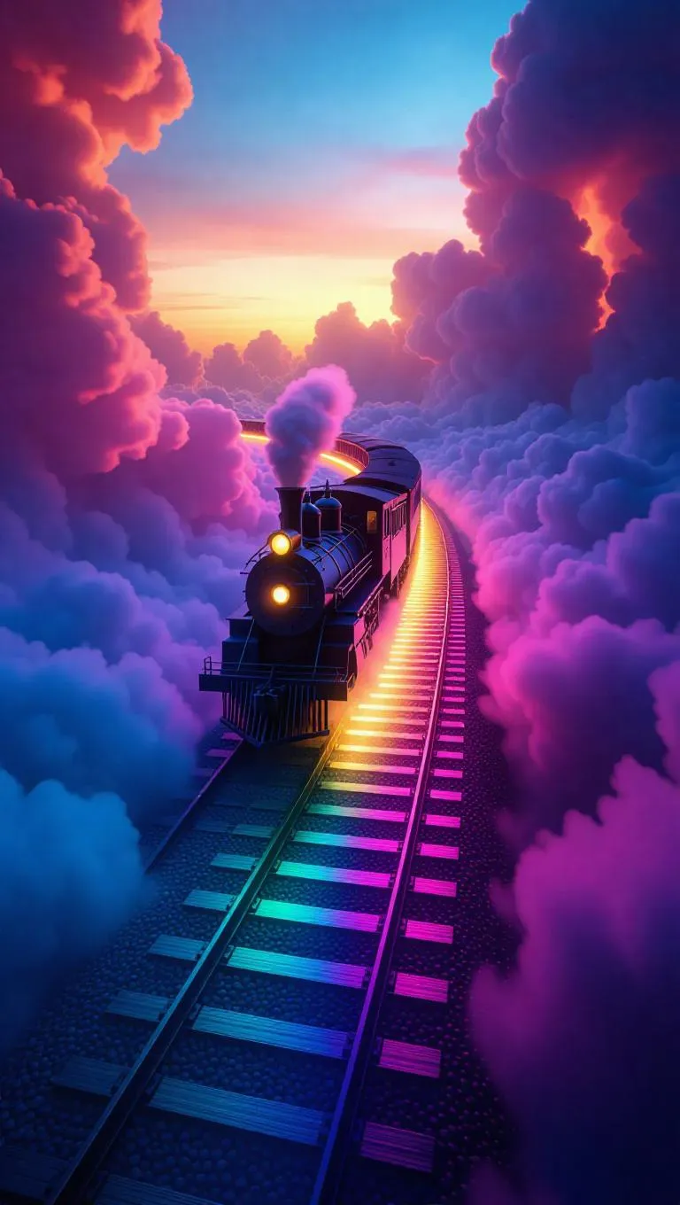 A spectral train made of shimmering shadows, gliding effortlessly along ethereal tracks laid across vibrant rainbow clouds, bathed in a soft, magical glow, with embers trailing behind, creating a dreamlike and enchanting atmosphere.