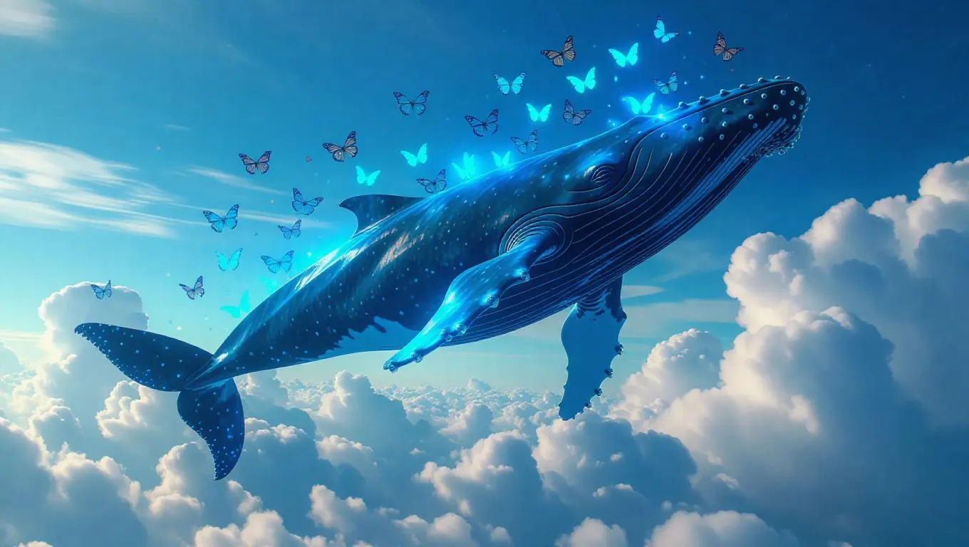 A colossal whale soaring through the cheerful blue sky, gliding playfully over fluffy clouds, with radiant butterflies entwined around its body, casting a mystical glow, creating a surreal and enchanting scene