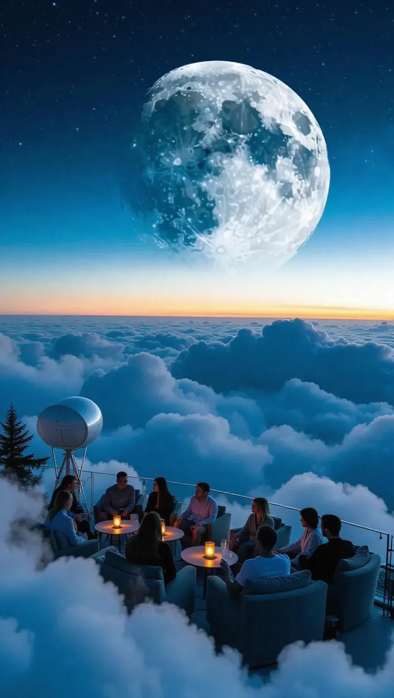 Guests flock to expansive, fluffy cloud vistas with sophisticated telescopes and comfortable lounge areas. Expert astronomers narrate enchanting tales and information about celestial wonders, while others delight in cloud-inspired treats and stellar lemonade beneath the shimmering light of a full moon.