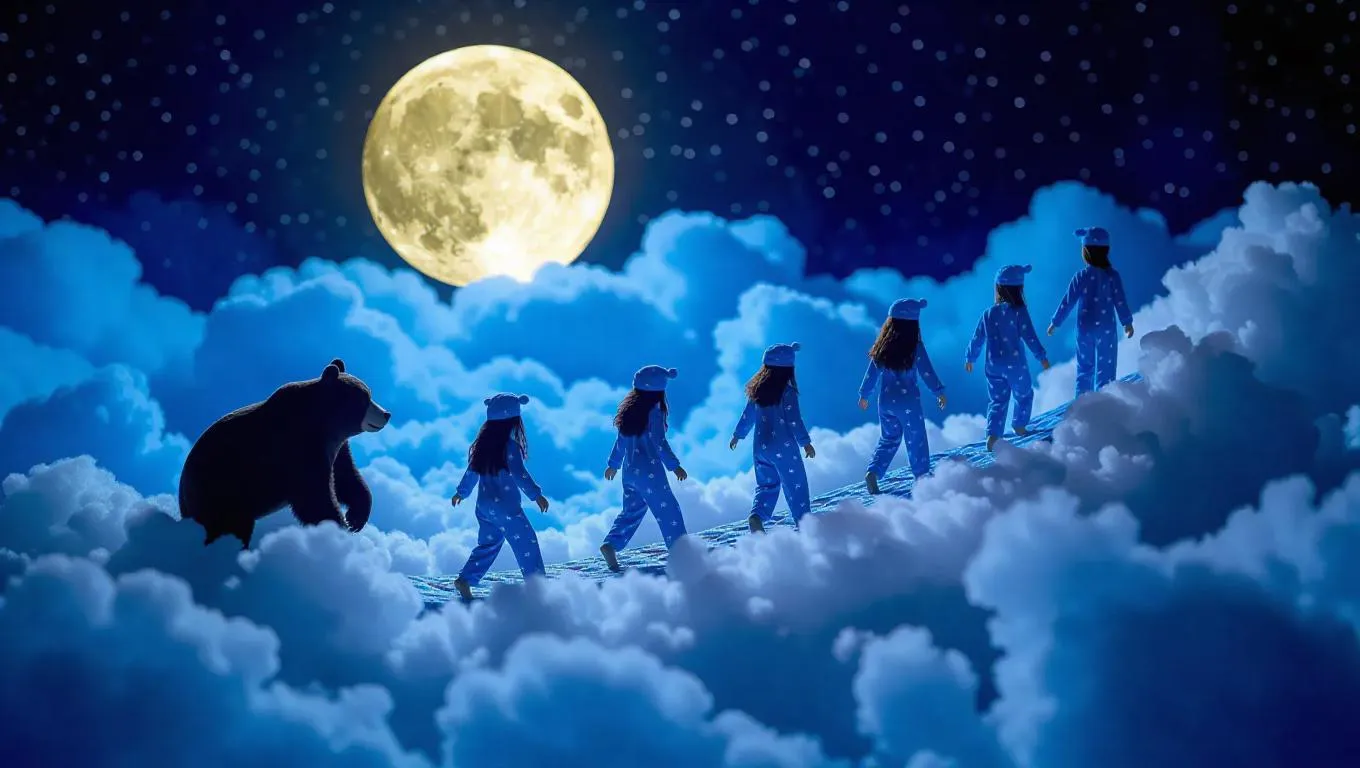 Aunt Moon weaves a magical blanket runway across the night clouds with shimmering starlight, young models walk in enchanted storytelling pajamas. Bear pajamas purr softly with each step, star nightcaps play soothing lullabies. The audience is cloud babies nestled in fluffy cotton candy quilts.