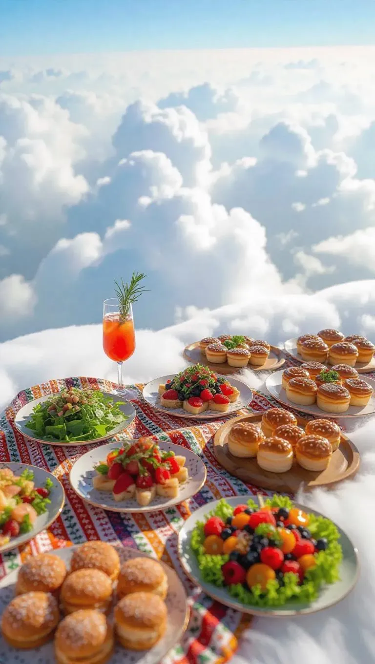 Above the clouds, a festive meal unfolds on a vast, cushioned expanse of soft, fluffy clouds. A patterned cloth, shimmering with tiny star-like sparkles, is spread out, adorned with an array of scrumptious treats. Wooden boards hold salads made with greens as fresh as clouds, filled with slices of seasonal fruits that seem to capture the essence of the sun, surrounded by hearty pastries and sparkling beverages.
