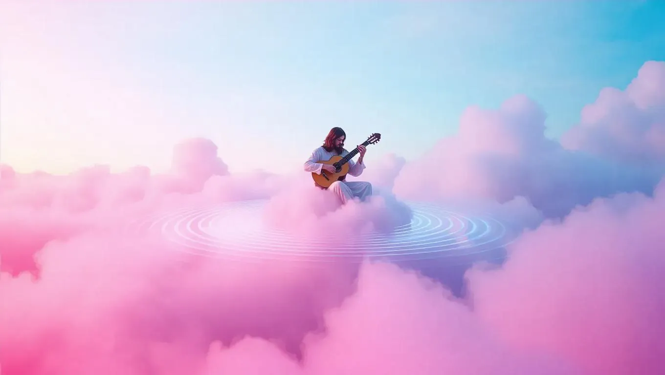 A lone figure passionately playing a lute atop a soft, pink cloud, each melodic note creating flowing ripples in the surrounding haze, bathed in a bright, white light that enhances the dreamy atmosphere.