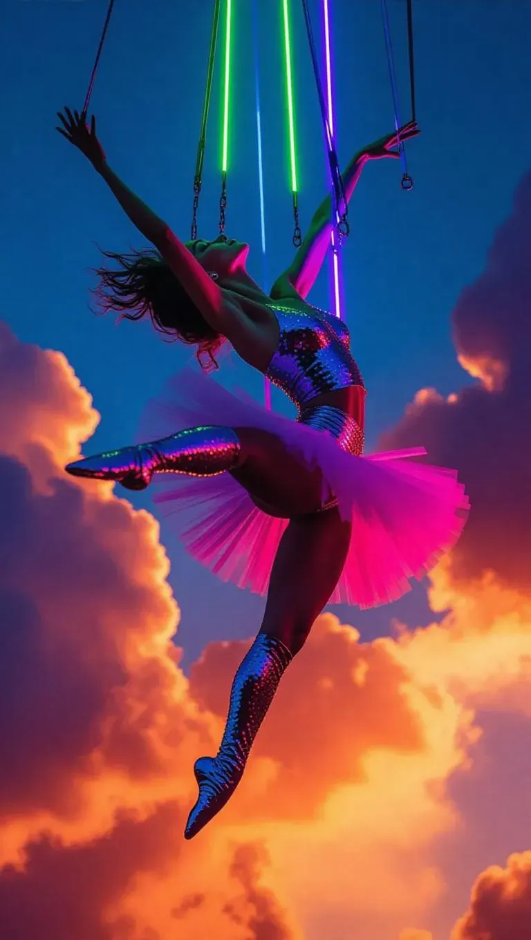 17. Graceful dancers in shimmering sequined costumes, suspended by bright neon harnesses, perform intricate routines amidst vibrant city clouds. They twirl and somersault, guided by gentle updrafts, their movements synchronized to soft, ambient music. The sky serves as a vast, ethereal canvas, enhancing the mesmerizing spectacle.