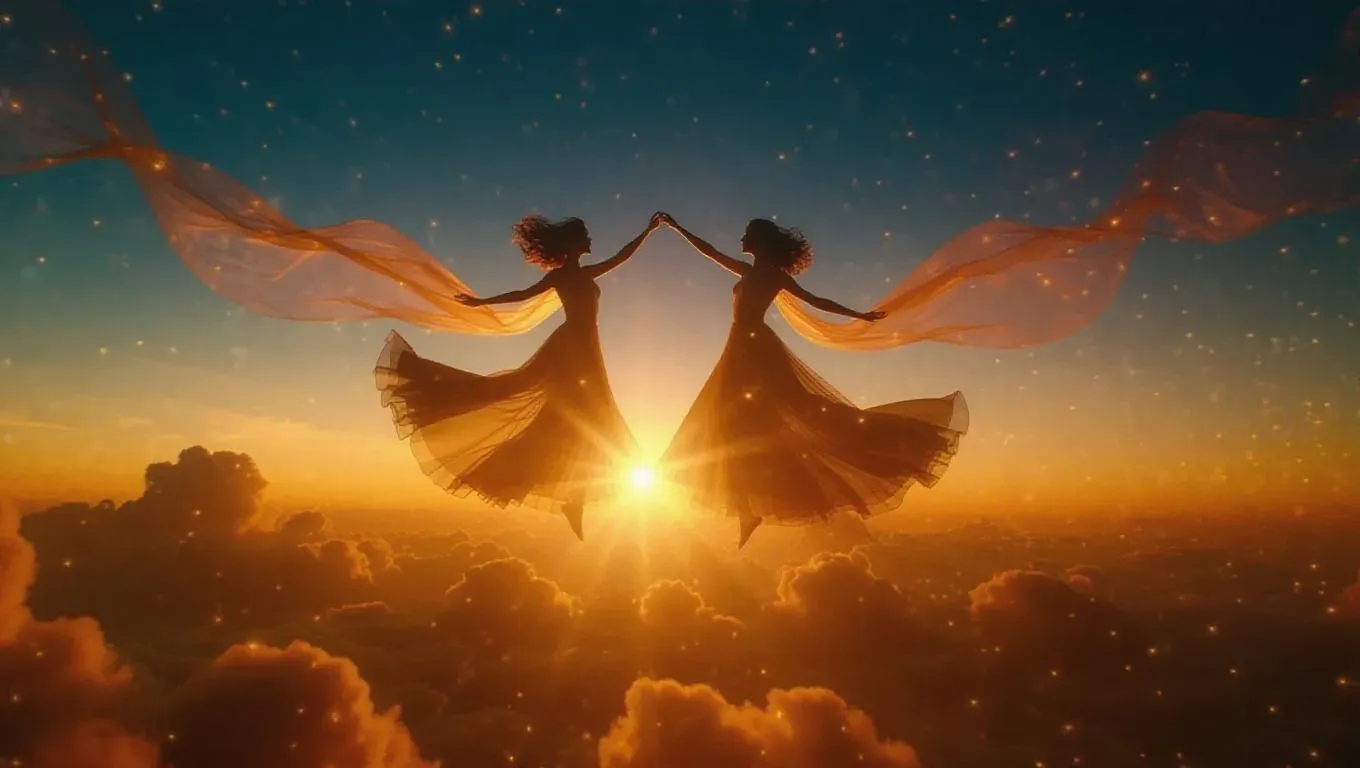 Two ethereal celestial beings waltz across a vast sea of golden clouds, their ethereal garments woven from the threads of twilight and morning. Each graceful leap sends shimmering ripples through the air, awakening dormant fireflies that dance in glowing spirals, while the wind hums an ancient, mystical melody.