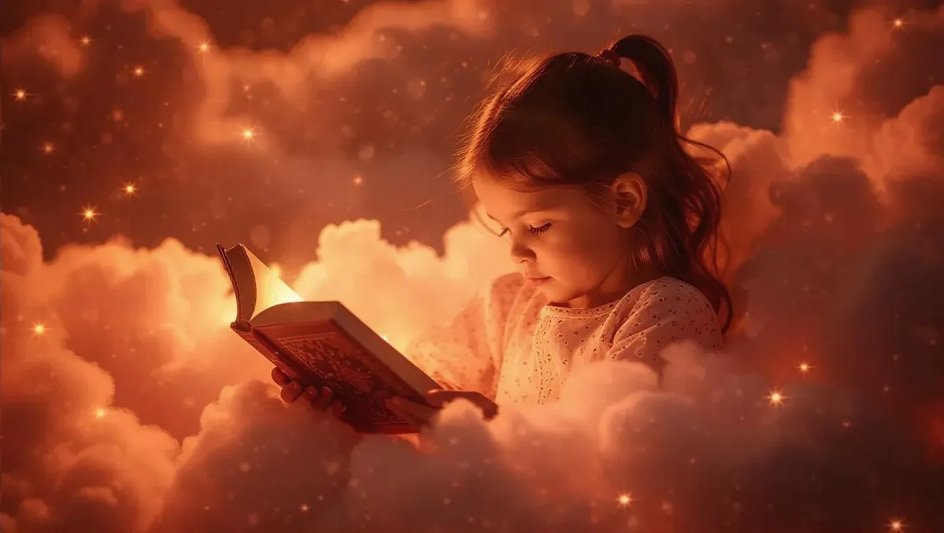 A child resting on a fluffy cloud, enchanted by a glowing book, warmed by soft, rosy lighting, surrounded by radiant stars and gentle mist, creating a magical and serene atmosphere