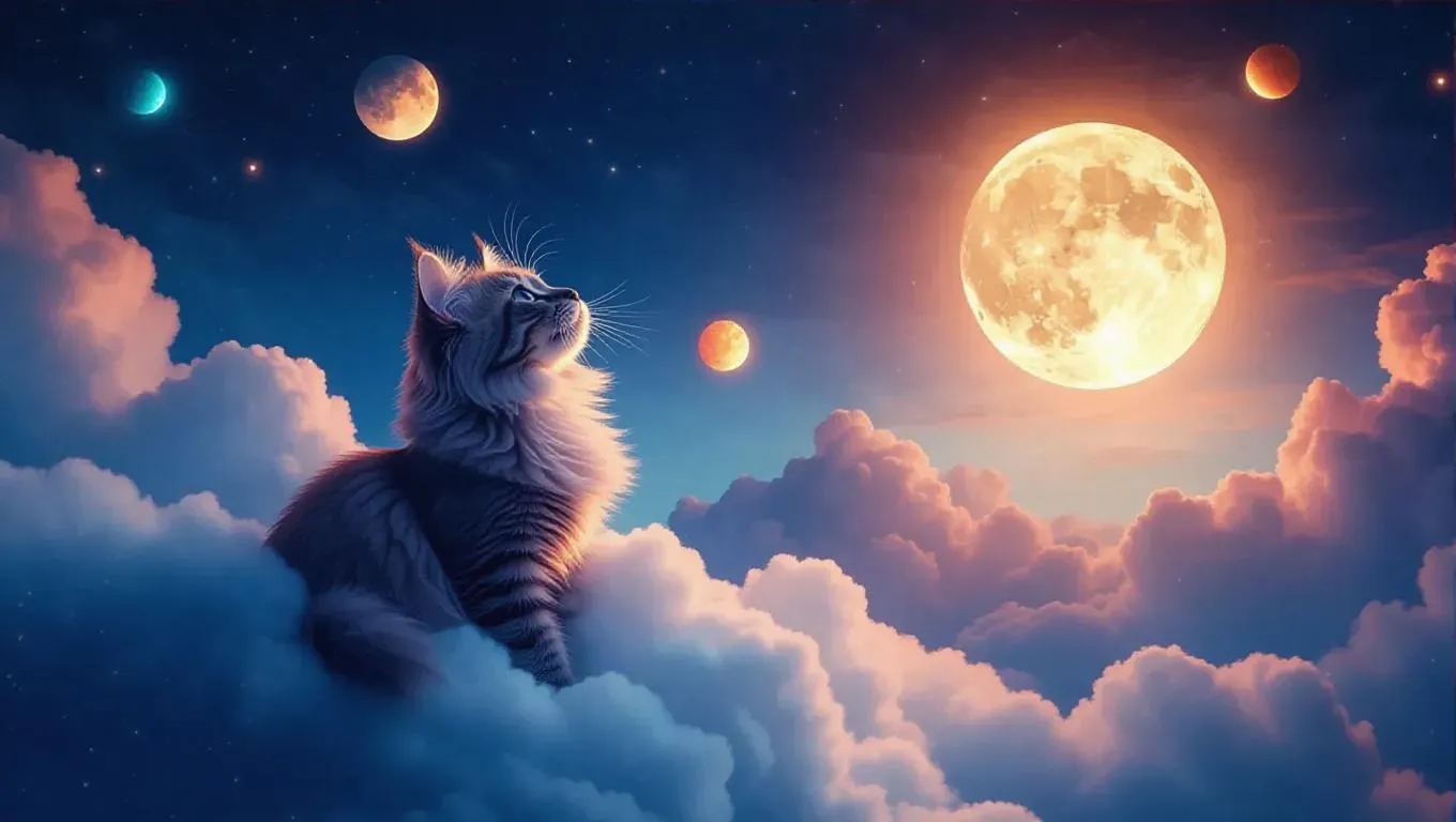 A fluffy cat perched on a cotton-soft cloud, curiously batting at bright glowing planets, surrounded by a vivid dawn sky with scattered clouds and a bright full moon, creating a whimsical and magical atmosphere.