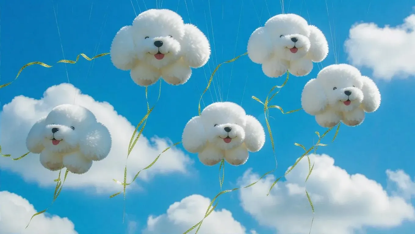 Fuzzy, cloud kites shaped like puppies with floppy ears and puffy tails flutter in the sky, each adorned with a shimmering gold ribbon trailing in a sparkling stream. Cherubic sky sprites giggle as they tug on the strings, making the kites perform flips and chase floating ice cream clouds.