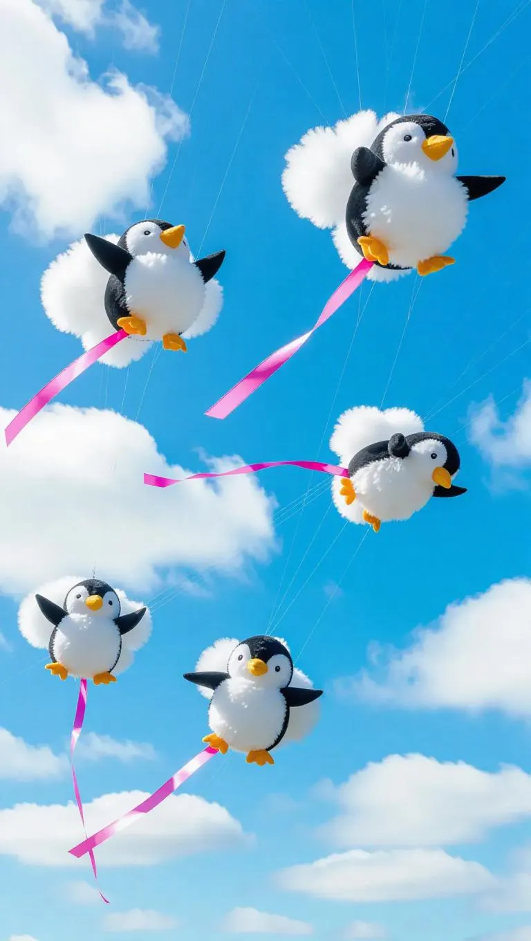Fuzzy, cloud kites shaped like penguins with flipper tails and chubby bodies flutter in the sky, each adorned with a bright pink ribbon trailing in a shimmering stream. Cherubic sky sprites laugh as they tug on the strings, making the kites perform twists and chase floating vanilla clouds.