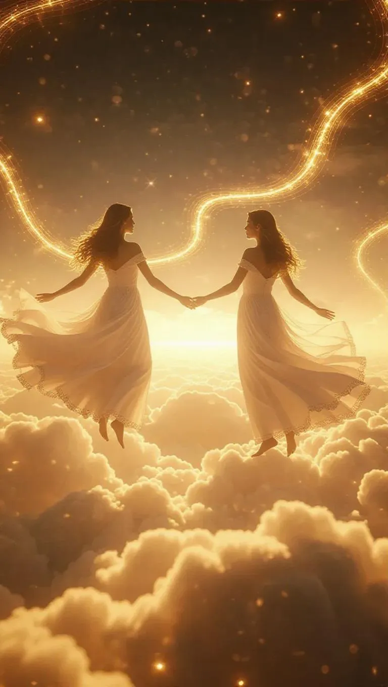 Two ethereal celestial beings waltz gracefully across a vast sea of golden clouds, their robes woven from the threads of twilight and brightness. Each delicate leap sends shimmering ripples through the air, awakening dormant fireflies that flutter in glowing spirals, while the wind hums an ancient, mystical melody.