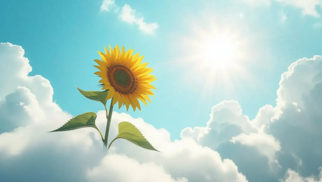 A lovely sunflower growing from a soft cloud, its cheerful petals stretching toward a dazzling sun, beneath a sky filled with tones of light blue morning, creating a joyful and serene environment.