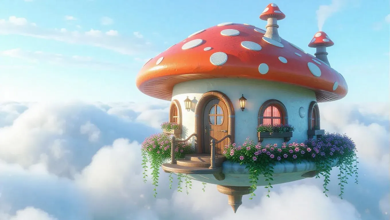 Small, mushroom-shaped houses crafted from a blend of cloud and divine breeze, floating lightly above the fluffy clouds. Vivid caps with polka dots and star shapes, sturdy spiral stems. Tiny doors and windows with translucent curtains, flower boxes bursting with glorious blossoms, enhancing the enchanting landscape.