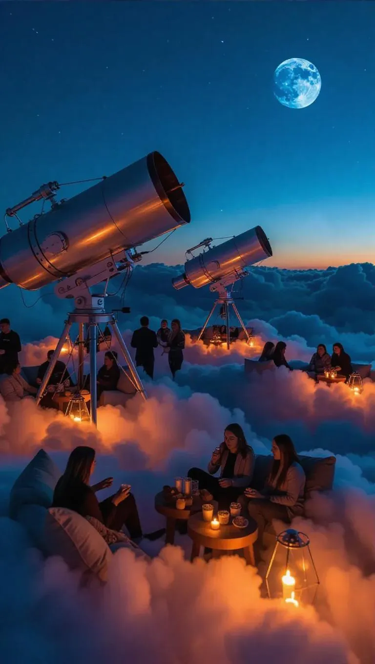 Guests gather on wide, pillowy clouds equipped with modern telescopes and inviting lounging areas. Expert astronomers recount mesmerizing stories and details about the universe, while others enjoy festive snacks of cloud-inspired desserts and twilight punch beneath the glowing aura of a full moon.