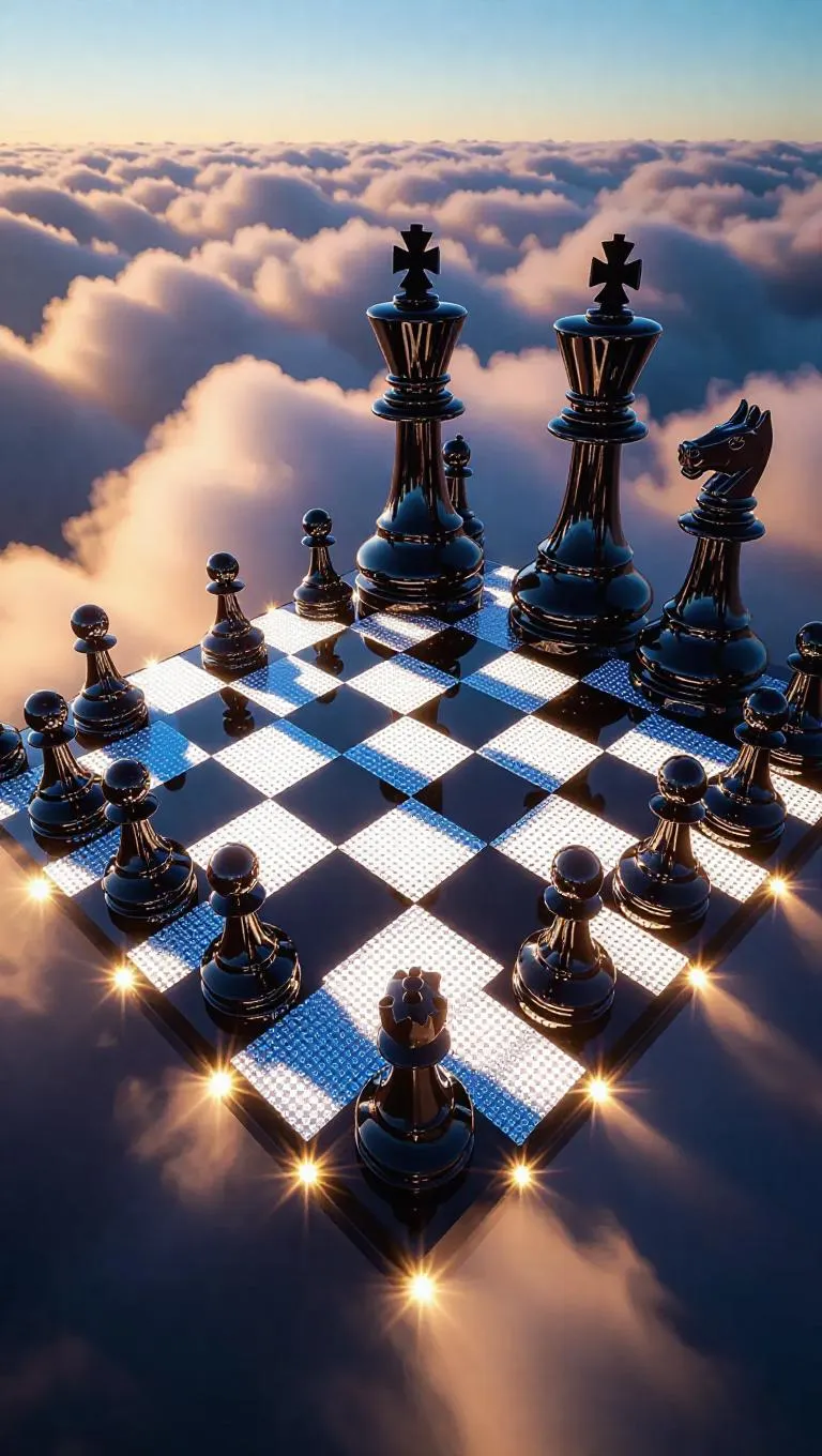 A colossal, shimmering chessboard floats serenely above the clouds, its black and white squares crafted from twinkling lights. Each square glows softly, edges lined with sparkling crystals. Massive, living chess pieces—knights as determined turtles, bishops as gentle giants—move gracefully, casting long shadows on the cloud-sea below.