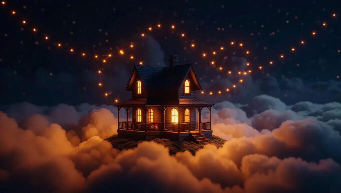 A whimsical home perched on a fluffy cloud, warm golden light shining from its windows, surrounded by gentle currents. Above, magical lights dance in the night sky, creating a magical and serene atmosphere.