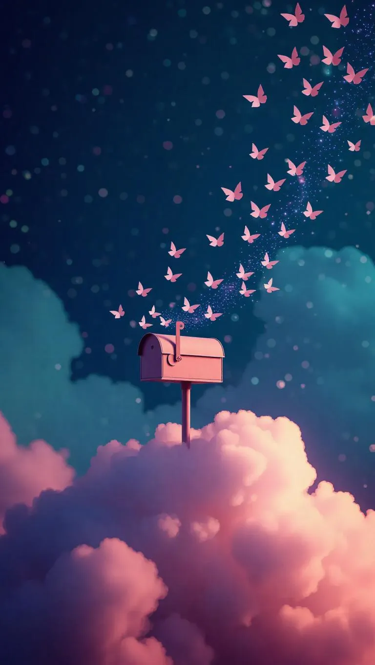 A whimsical mailbox perched atop a fluffy cloud, surrounded by glittering fairy dust, with delicate paper birds fluttering out, creating a magical sky filled with vibrant colors and soft, ethereal light.