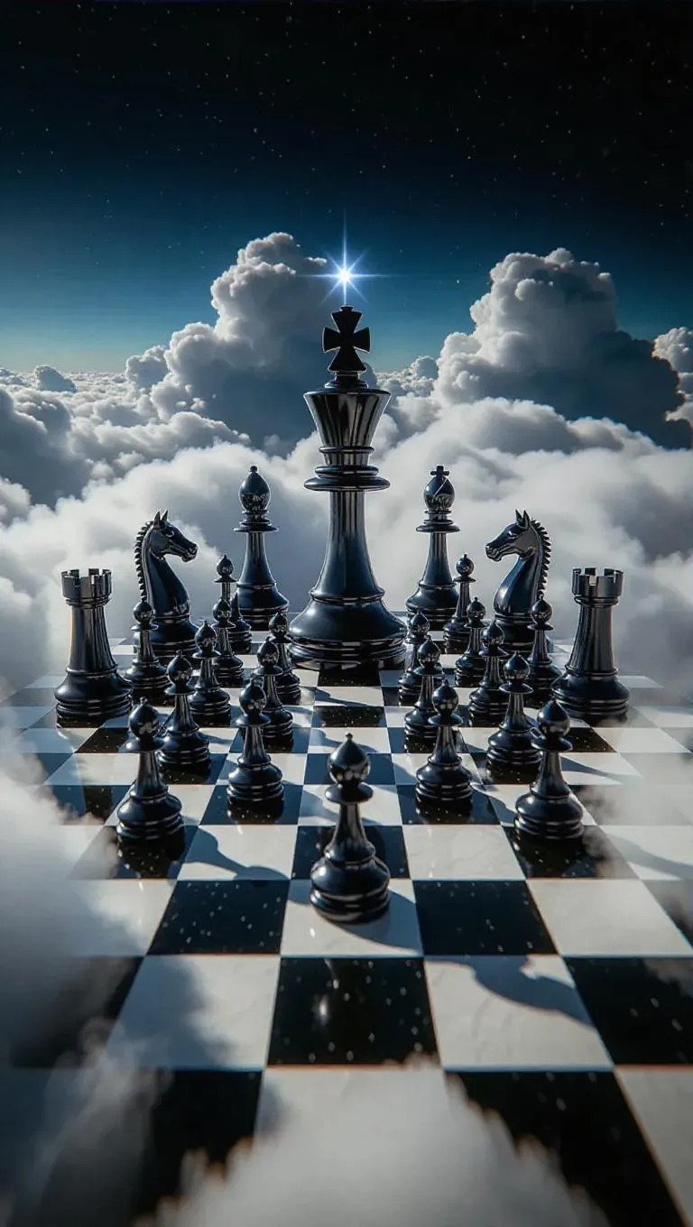 A colossal, shimmering chessboard floats serenely above the clouds, its black and white squares crafted from cosmic crystal. Each square glows softly, edges lined with fleeting shooting stars. Massive, living chess pieces—knights as glorious unicorns, bishops as magical sea serpents—move gracefully, casting long shadows on the cloud-sea below.