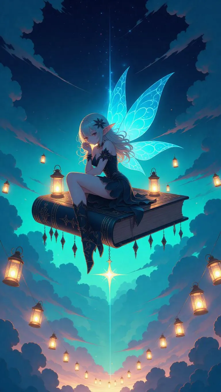 A petite, illuminated fae rests on a timeless, storied grimoire suspended in mid-air, its designs glowing with radiant silver script. Surrounding them, whimsical cotton-like clouds spread endlessly, sprinkled with ginger-leaf lanterns and drifting dandelions, while a faint aurora flickers in the background of the darkened sky.