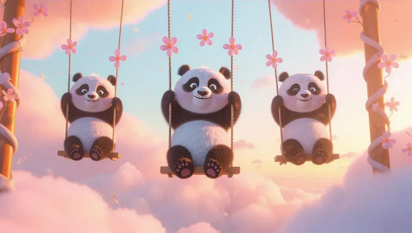 Fluffy, black-and-white cloud pandas swing playfully between dreamlike cloud pillars. Button noses twitch eagerly, sleepy eyes crinkle with delight as they grip glowing flower-shaped ropes. Puffy paws dangle freely, clouds billow softly beneath them. Tiny cloud fairies hitch rides, giggling as they soar through the pastel sky, carried by the gentle breeze and the rhythmic sway of the panda swings.