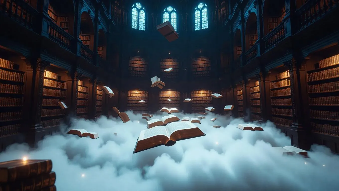 A majestic library suspended on a cloud, ancient books floating around and glowing faintly, ethereal light casting soft shadows, surrounded by swirling mist and celestial stars.