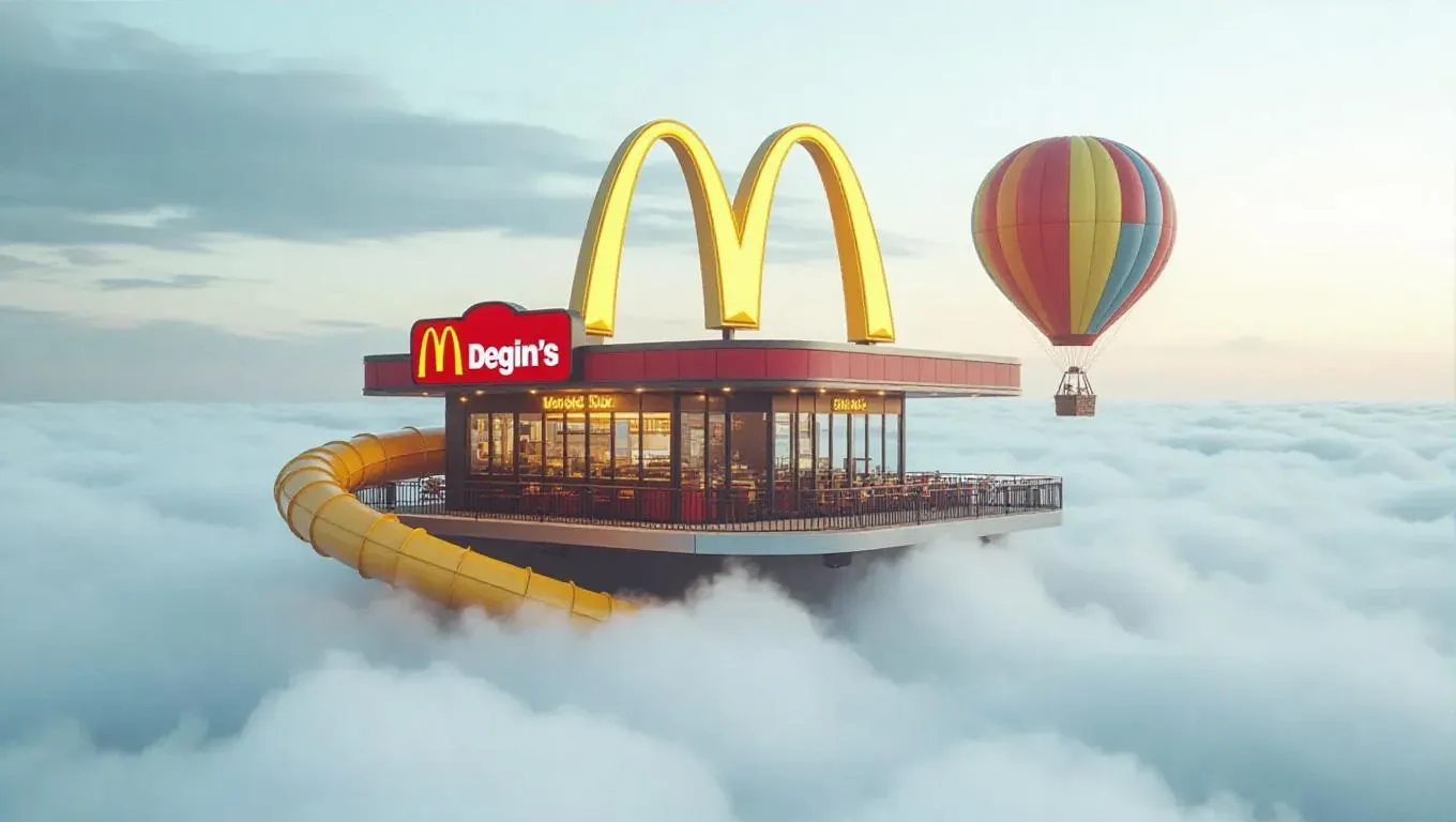 A whimsical McDonald's restaurant floating above a sea of fluffy white clouds, the iconic golden arches glowing warmly against a cloudy grey sky. The restaurant features a giant spiral slide and a colorful hot air balloon tethered nearby, adding a whimsical, adventurous vibe.