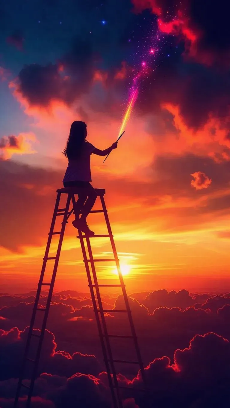 A girl perched on a ladder in a celestial setting, creatively painting the sky with each stroke, transforming the colors of the sunset into a mesmerizing blend of vibrant oranges, capturing the magic of twilight