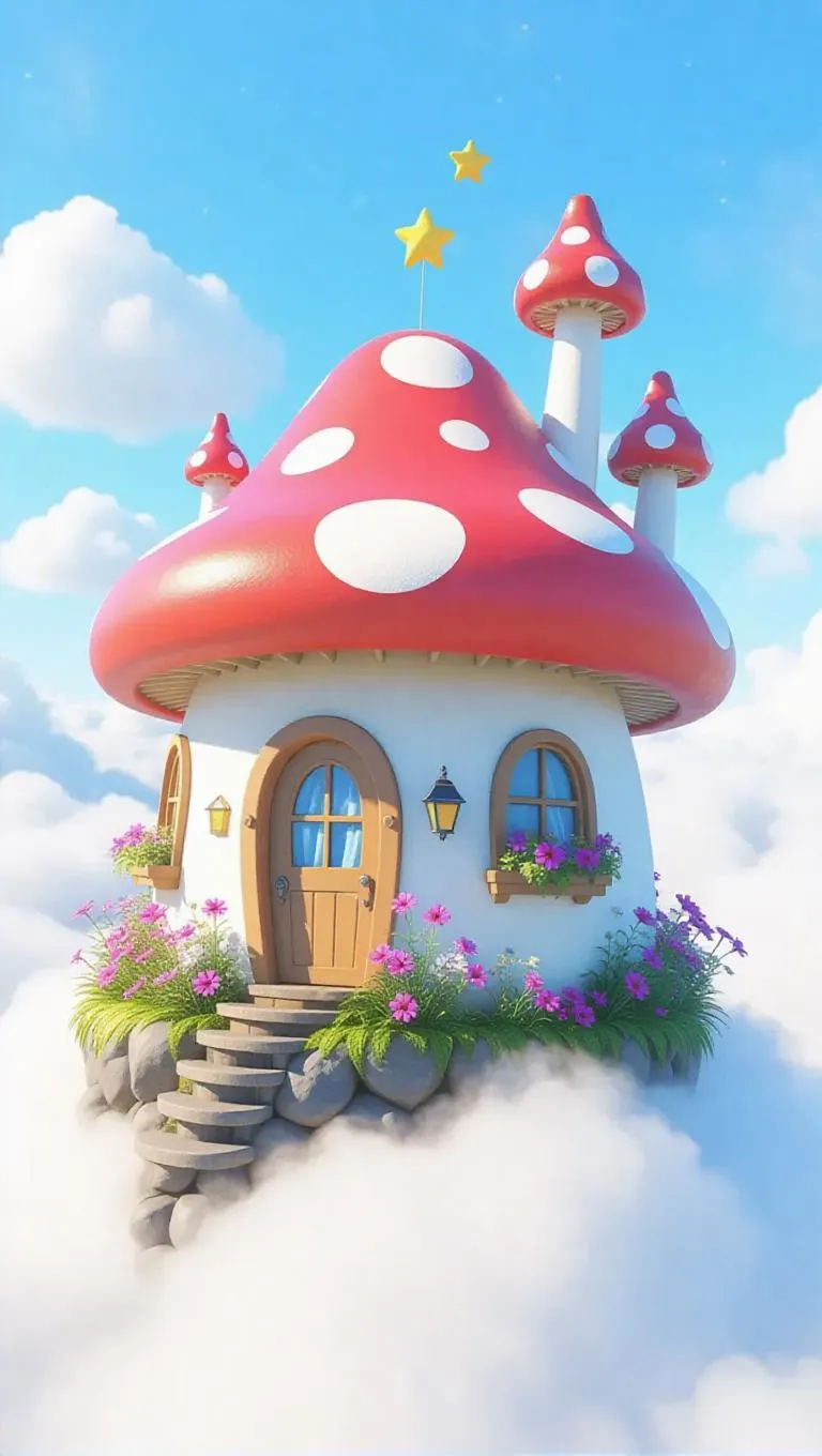 Small, mushroom-shaped homes crafted from a combination of cloud and sunlight, floating merrily above the fluffy clouds. Brightly colored caps with prints of stars and stripes, thick sprouted stems. Tiny doors and windows with waving curtains, flower boxes bursting with dazzling blooms, enhancing the enchanting vibe.