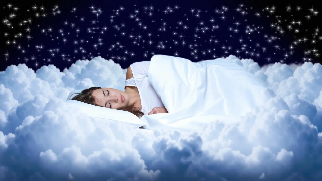 A bed made of clouds, with a person wide awake, floating among constellations