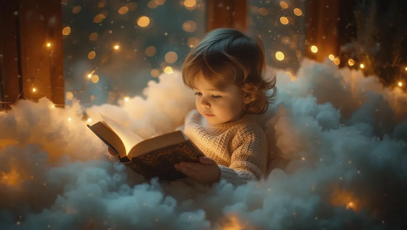 A child snug on a fluffy cloud, deeply involved in a glowing book, wrapped in soft, bronze lighting, surrounded by twinkling stars and gentle mist, creating a magical and serene atmosphere