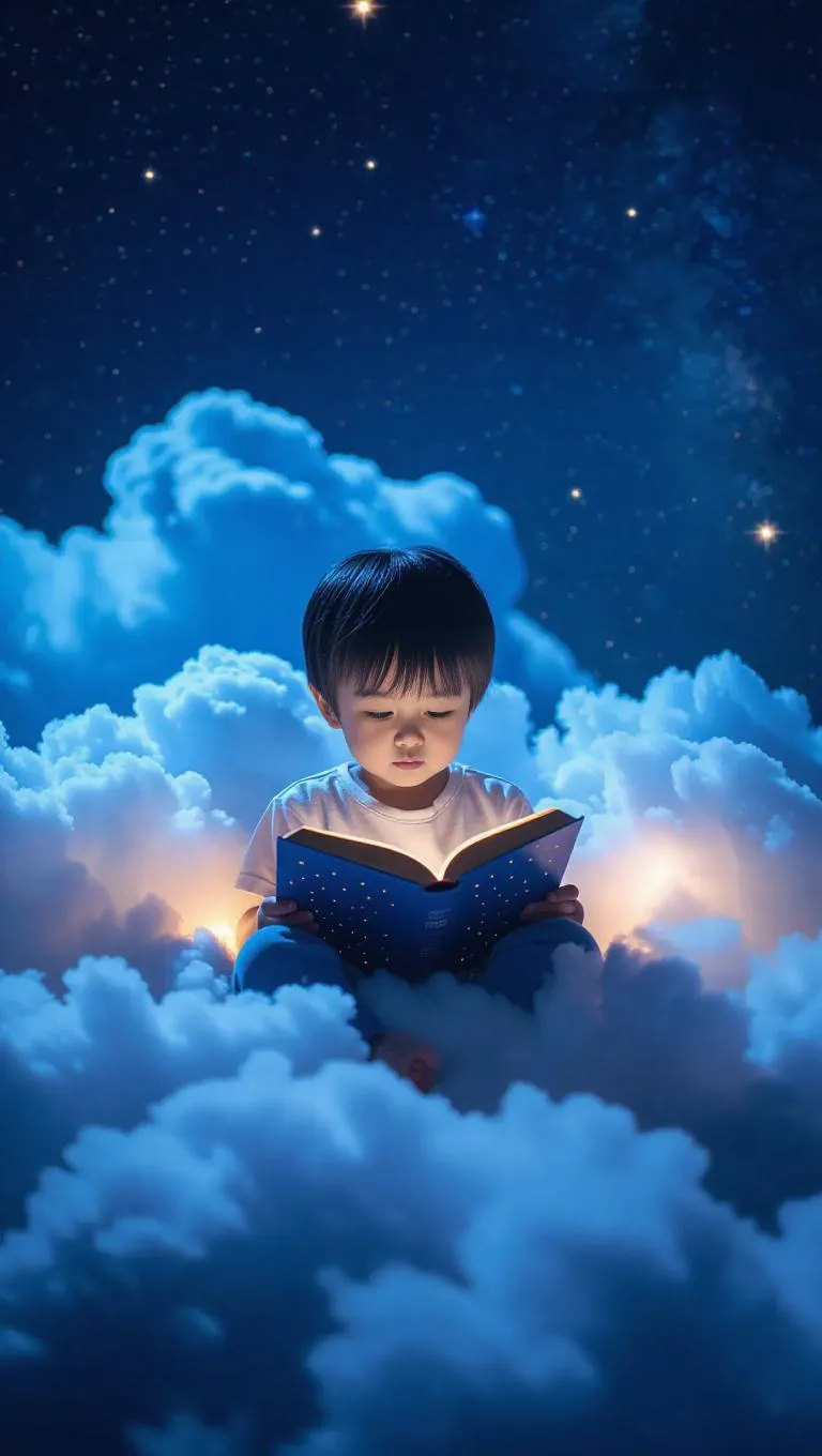 A child nestled on a fluffy cloud, engrossed in a glowing book, bathed in soft, ethereal lighting, surrounded by twinkling stars and gentle mist, creating a magical and serene atmosphere