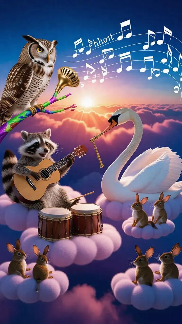High above the clouds, an enchanting animal orchestra takes center stage. A melodious owl with a warm, soothing voice croons into a brilliant conch shell microphone, while a lively raccoon strums a guitar made from a vibrant branch, its strings made of glistening spider silk. A stout mouse pounds rhythmically on drums formed from puffy clouds, and a graceful swan plays a flute made from a long, elegant reed, sending sweet notes fluttering through the air. Their audience, a flock of joyous canaries and a group of wide-eyed bunnies, sit on puffy cloud benches, swaying and clapping along as the music fills the sky with cheer.