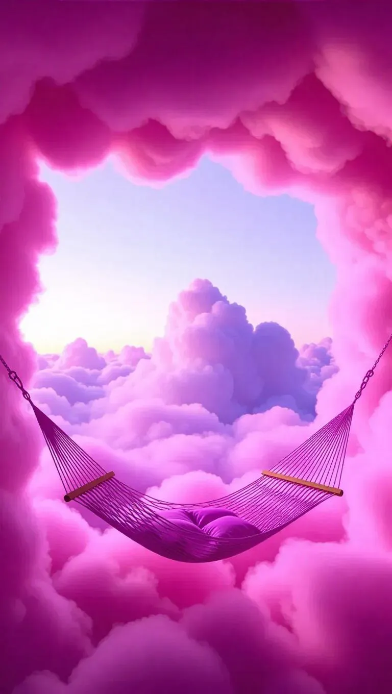 Suspended between two ethereal pink-cloud pillars, these hammocks woven from soft, breathable cloud-fibers sway gently with the breeze. Lying in them, you can bask in the serene rocking motion, gazing up at the expansive lavender sky and fluffy clouds, enveloped in a tranquil, stress-free atmosphere.