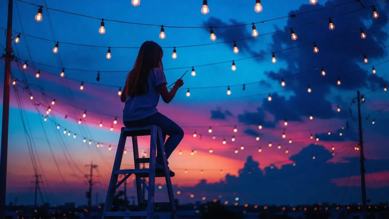 A girl perched on a ladder under twinkling lights, passionately painting the sky with each stroke, transforming the colors of the sunset into a mesmerizing blend of glowing hues, capturing the magic of twilight