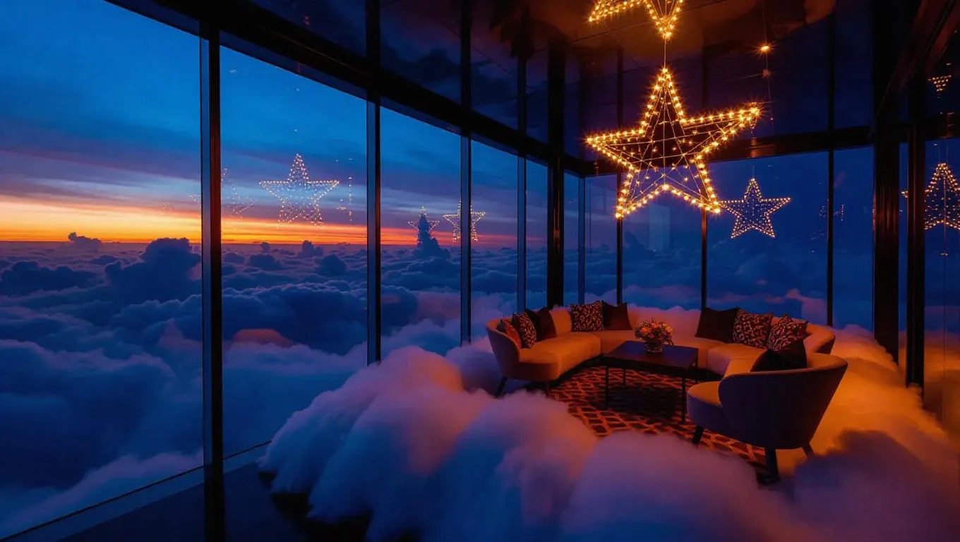 Above the clouds, a lovely event space perches on a fluffy cloud platform. Its festive walls shimmer with twinkling starlight, and a glowing decoration sign beckons visitors. Large windows frame breathtaking views of the sky, allowing cheerful light to flood the cozy interior.