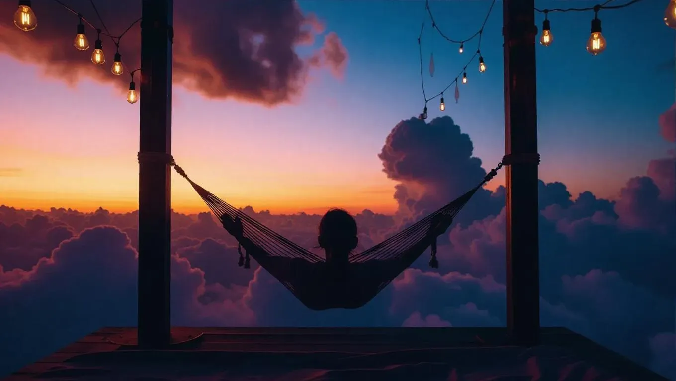 Suspended between two vibrant sunset-cloud pillars, these hammocks woven from soft, breathable cloud-fibers sway gently with the breeze. Lying in them, you can bask in the serene rocking motion, gazing up at the expansive twilight sky and fluffy clouds, enveloped in a tranquil, stress-free atmosphere.