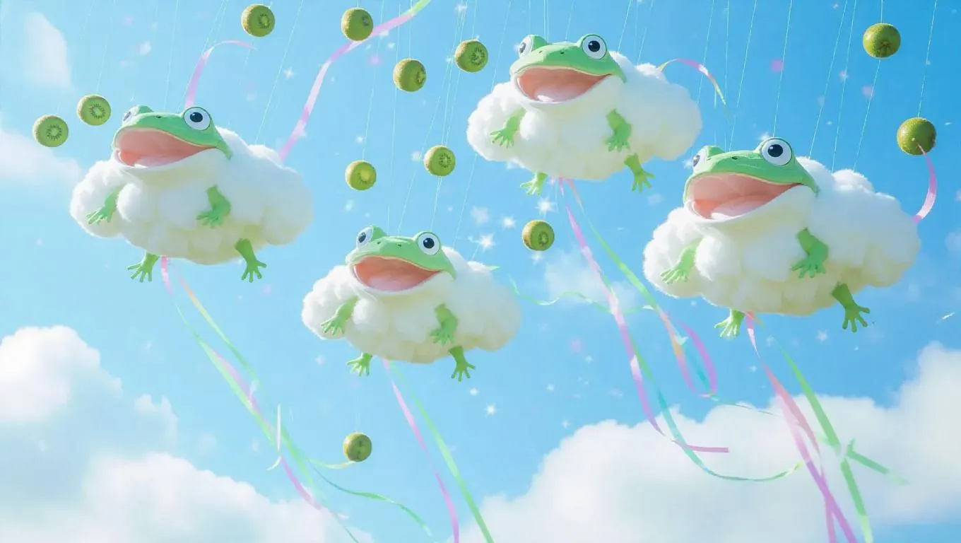 Fuzzy, cloud kites shaped like frogs with wide mouths and soft tails flutter in the sky, each adorned with a pastel ribbon trailing in a sparkling stream. Cherubic sky sprites hop as they tug on the strings, making the kites perform jumps and chase floating kiwi clouds.