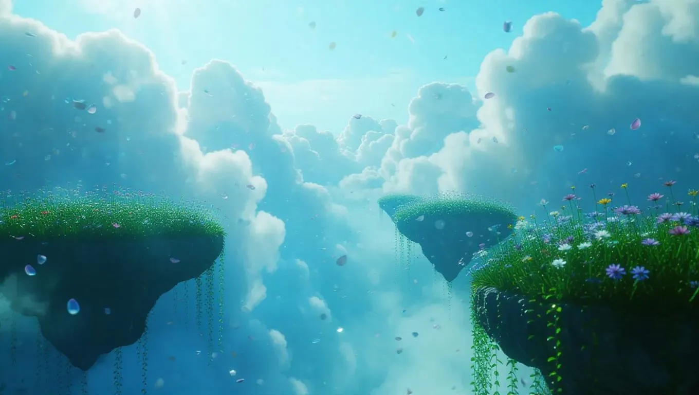 A mystical meadow blooming above the clouds, floating petals in the breeze, vibrant flowers cascading from hovering platforms, ethereal mist adding a soft haze, sunrays filtering through the cotton-like clouds, creating a peaceful and dreamlike atmosphere