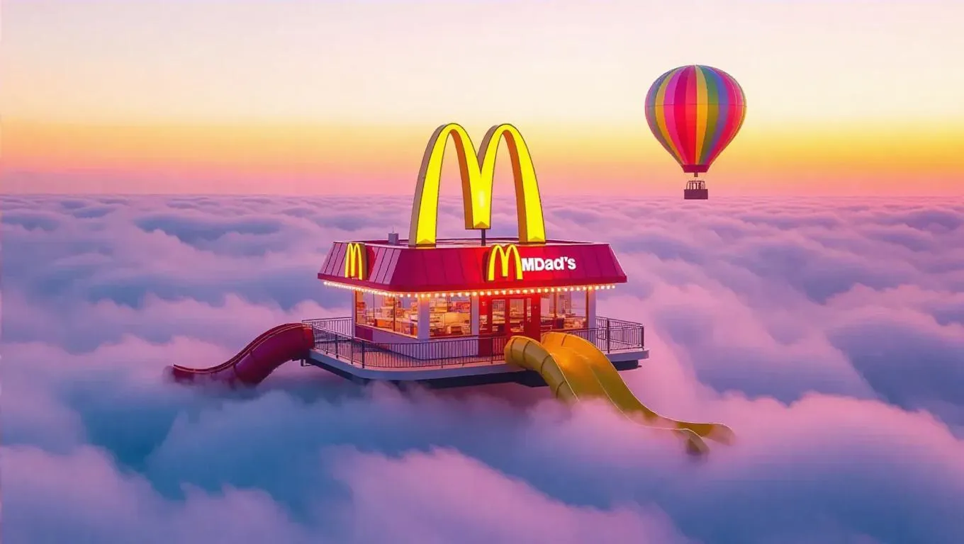 A whimsical McDonald's restaurant floating above a sea of fluffy white clouds, the iconic golden arches glowing warmly against a pale yellow sky. The restaurant features a giant spiral slide and a colorful hot air balloon tethered nearby, adding a cheerful, sunny atmosphere.