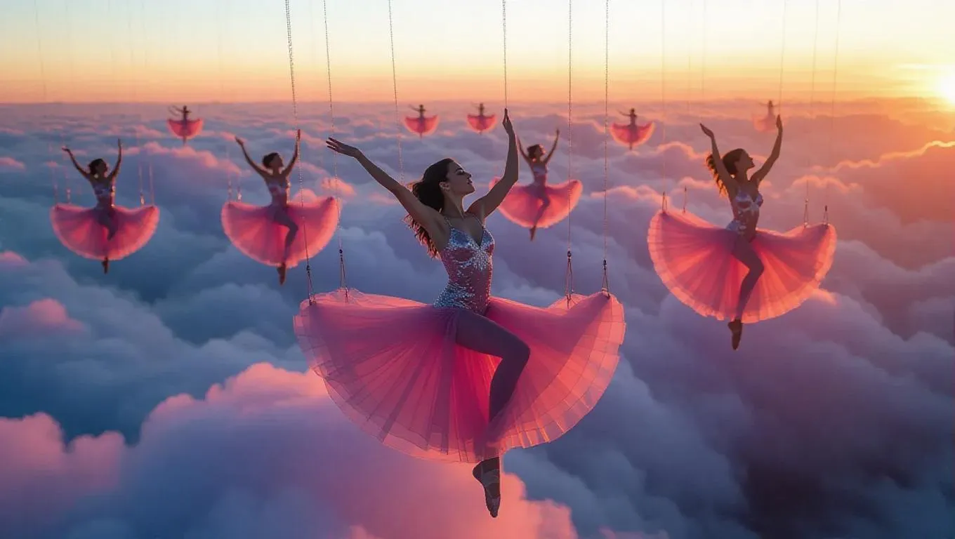 Graceful dancers in floating, iridescent costumes, suspended by cloud-harnesses, perform intricate routines amidst fluffy clouds. They twirl and somersault, guided by gentle updrafts, their movements synchronized to soft, ambient music. The sky serves as a vast, ethereal canvas, enhancing the mesmerizing spectacle.